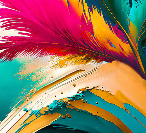 This abstract painting captures the essence of a colorful palm tree and leaves, emanating positive energy and a sense of magic. The vibrant hues, ranging from vivid blues and red to warm oranges and yellows, intertwine to create a mesmerizing visual experience that invites to explore the depths of imagination.